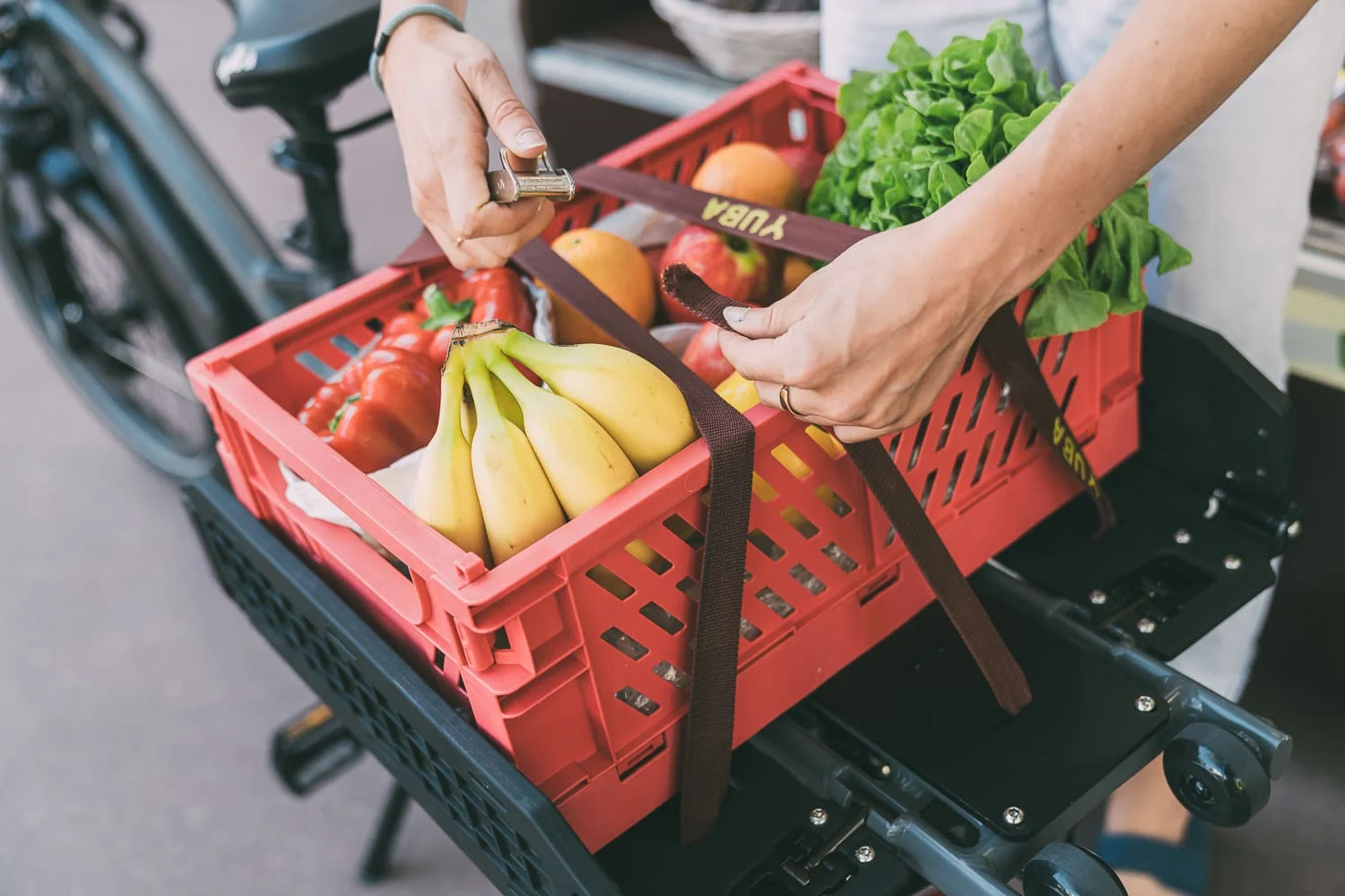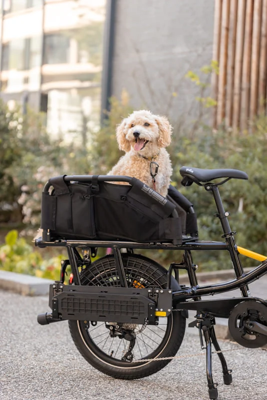 Discover the Dual Rack System, a unique integrated accessory developed by Yuba. 4 different positions to adapt in seconds to all your needs, there is necessarily a solution to your situation. With a simple click system, the luggage rack can be transformed into what is needed in a matter of seconds: a wide loading area with side walls (Carry on Mode) or without (Flat Mode), a seat with a footrest (Sideboard Mode) or the classic slim one loading area (Compact mode). So you always have the luggage rack you need. A front luggage rack completes the ensemble and multiplies the possible uses.